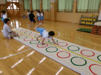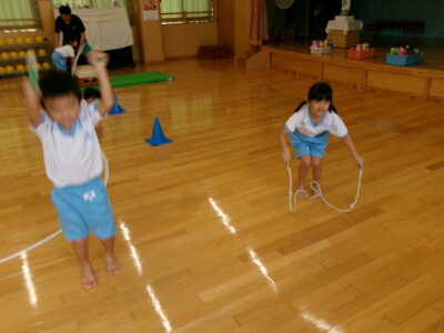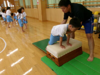 その後、なわとび・ライオン歩き(3本足)・とび箱の