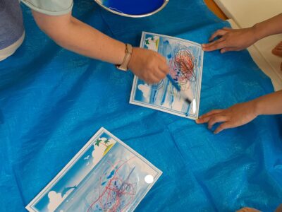 みんなの絵に海の絵の具で色を塗ってみると
