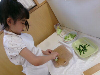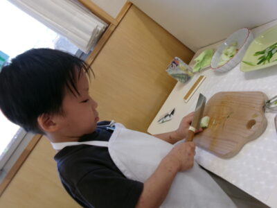 ピーラーや包丁を使う練習をしています!